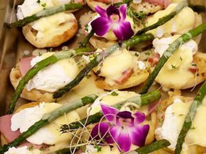 Poached Egg topped with Asparagus, Virginia Ham and Hollandaise Sauce served over Fresh Tomato and Micro Greens on English Muffin